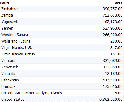 다음 select 명령은 countries에서 names와 area를 반환합니다.