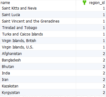 다음 Order By 구문은 countries를 정렬하기 위하여 region_id와 name을 사용합니다.