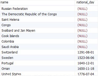 다음은 Order By를 사용하여 national_days로 countries를 정렬합니다.