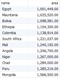 다음 Where 구문은 area가 2,000,000 km2 이상인 countries를 찾는 구문입니다.