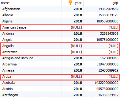 GDP 정보를 가지고 있지 않은 나라를 찾으려면 다음과 같이 쿼리문을 작성하면 됩니다.
