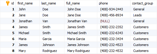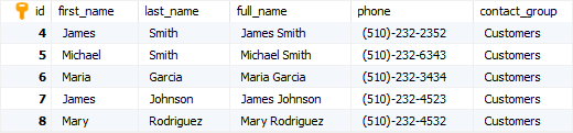 이 예제에서 where 절은 그룹이 Customers인 모든 연락처를 반환해줍니다. set 절은 replace() 함수를 사용하여 phone column의 (408)에서 (510)으로 수정합니다.